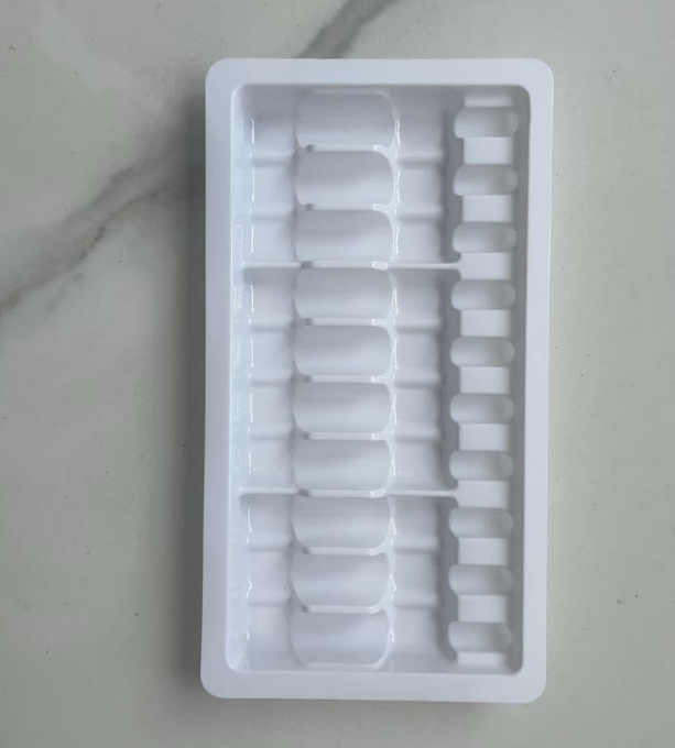 2 ml 10-częściowy uszczelnionej dostosowywania tacki do butelek. Dostępne w dwóch rozmiarach: 14,3*7,3 cm lub 15,4*8,3 cm. Hurtownia 10 plastikowych tac z PVC dla 1 ml próżni igły wodnej tworzących wewnętrzną tacę dla medycyny. Dostosowana taca na butelkę ampułki do opakowań medycznych, w tym opakowanie do dyspozycji dla ampułki 1 ml, 2 ml, 3 ml, 5 ml i 10 ml.